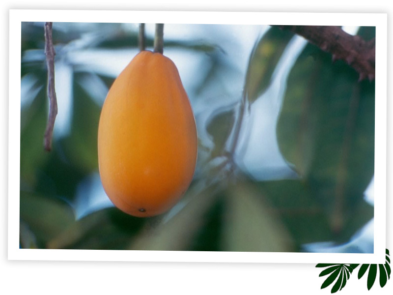 branca e um fruto amarelo por fora, da feição e tamanho dos figos (…) tem essa fruta a casca que se lhe apara quando se come. Tem bom cheiro e sabor que toca o azedinho e tem sementes pretas que se lançam fora”.